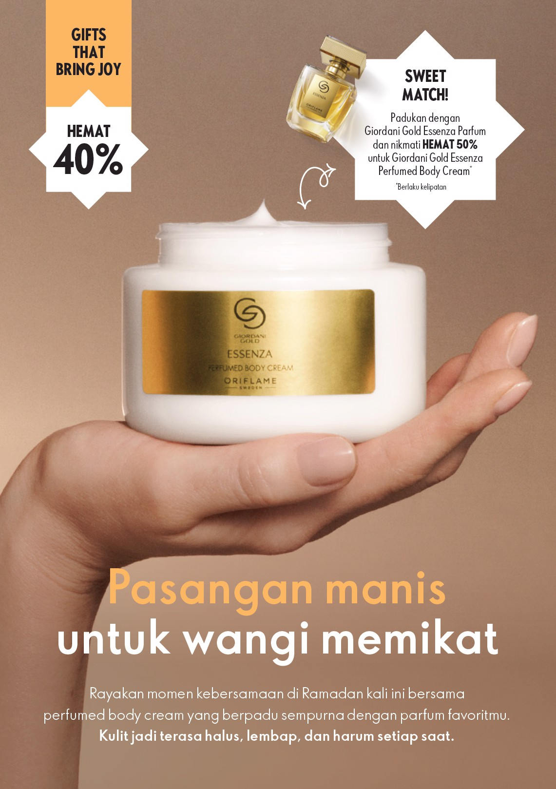 Wewangian Oriflame Volare Gold Eau de Parfum - Seperti momen keemasan dalam cinta abadi, Volare Gold Eau de Parfum memikat dengan sentuhan sensual penuh kilau floral-gourmand- rose. Aroma intinya yang feminin mempesona mekar melalui aroma rose grand amour, membungkus belaian manis peach dan salty caramel yang mewah dan memikat. Temukan lebih banyak penawaran dan produk terbaru di Panduan Kecantikan Oriflame Maret.