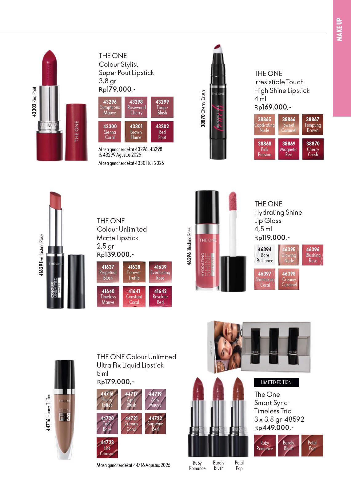Make-Up Oriflame The ONE Colour Unlimited Lipstick Super Matte - Hasil akhir super-matte yang tahan lama hingga 11 jam serta formula LipSoft Moisture Plus-nya membantu bibir terasa halus, lembut, dan nyaman untuk pemakaian yang lama. The ONE Colour Unlimited Super Matte kini menghadirkan lima warna terbaru nan trendi. 1,7 gr. Nocturnal Red - Furtive Raspberry - Enigmatic N ude - Secret Blush - Mysterious Purple. Dapatkan penawaran dan produk terbaru melalui Oriflame beauty guide Maret.